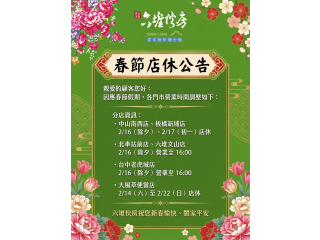 2026年節休館公告六堆伙房 春節店休公告 親愛的顧客您好: 因應春節假期,各門市營業時間調整如下: 中山南西店、板橋新埔店 ・2/16(除夕)、2/17(初一)店休 北車站前店...MORE -